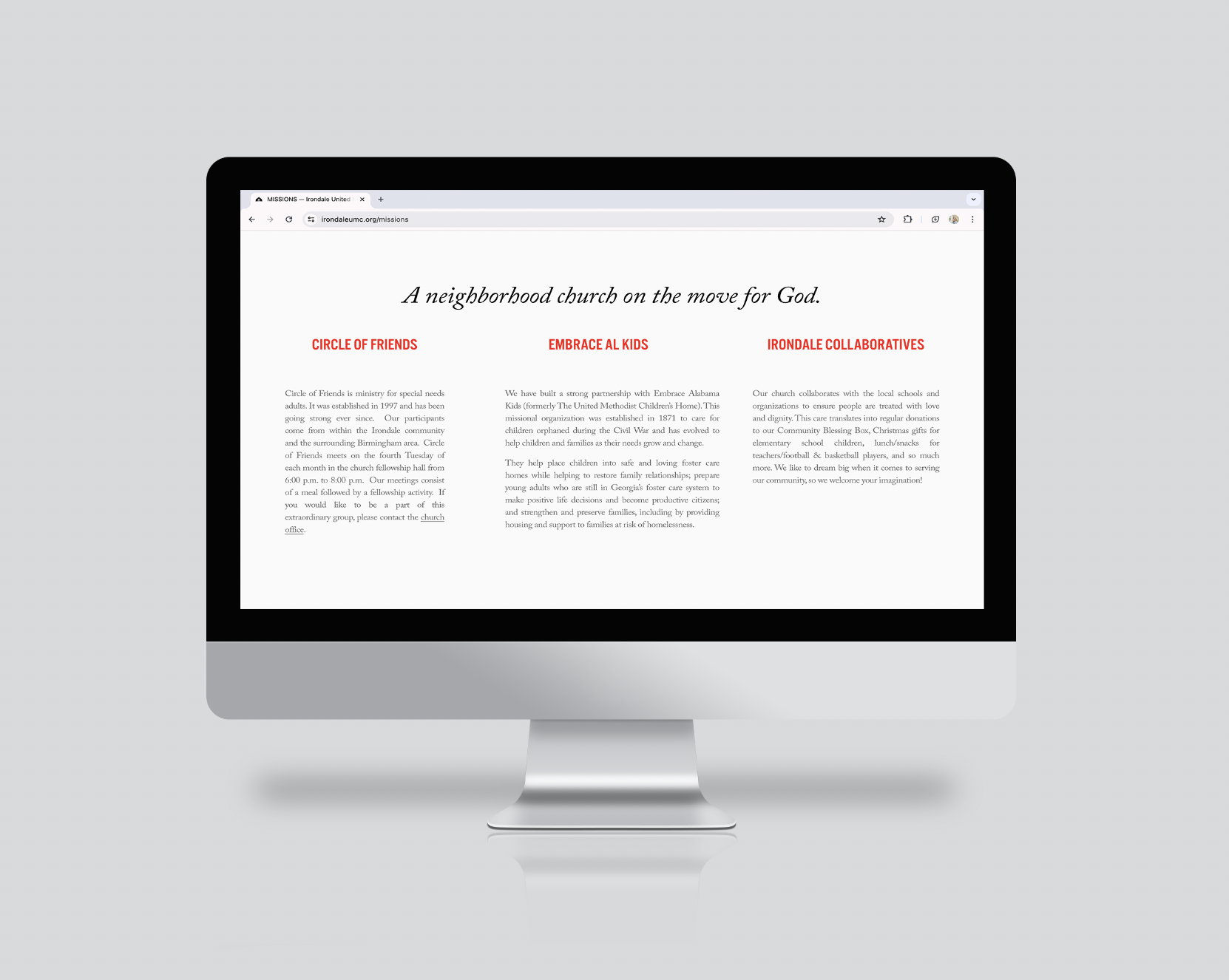 In the winter of 2023, I partnered with a local church in Irondale, Alabama to build them a new website. I photographed their staff and multiple church services to contribute to an album to of media to use in their website. I built the site to achieve the goals discussed with the client: a visually appealing, easily navigated, modern website. visit the full site here
